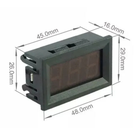 The Digital DC Voltmeter 2-Wire 3-Digit LED Display (5–120V) is a compact and reliable panel meter designed for accurate DC voltage monitoring. With a bright 3-digit LED display and a wide operating voltage range of 9–96V, it delivers clear and precise readings while consuming only 5mA of current. Its small size (48 × 29 × 16 mm) and lightweight design (20g) make it ideal for DIY electronics projects, power supplies, batteries, automotive applications, and control panels. Built to operate in temperatures from -10°C to 65°C, this voltmeter ensures stable performance in various environments.